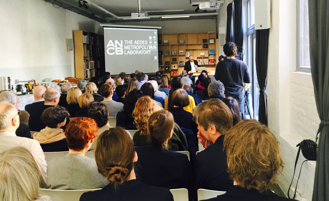 Die spannenden Themen der namenhaften Referenten lösten großes Interesse in der Architekturszene aus. So kam es, dass bereits zwei Wochen vor Veranstaltungsbeginn die Anmeldung geschlossen wurde. 120 Plätze gab es im architektonisch spannenden Aedes-Veranstaltungsaal, die am Tag des Symposiums weitestgehend alle belegt wurden. Der Raum wurde über Eck errichtet, in dieser Ecke steht der Redner und stellt seine Präsentation vor einer Leinwand vor. Von beiden Seiten wurden Stuhlreihen aufgebaut, die den Referenten nie nur frontal erblicken. Diese ungewöhnliche Raumkonstellation bringt eine dynamische Präsentationsform mit sich und erzeugt zusätzliche Spannung. Im Außenraum bildet die über Eck-Lage einen gemütlichen Innenhof, der gerade in den Pausen bei wunderbaren Sonnenschein mit frischen, bunten Smoothies oder farbigen Sekt genossen wurde. Gerade für die jungen Studenten bot diese Situation eine interessante Chance mit vielen wichtigen und namenhaften Personen ins Gespräch zu kommen, die auch zahlreich genutzt wurden.