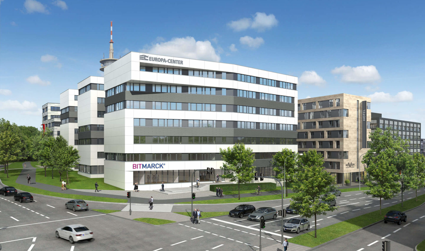 Seit Beginn des Jahres 2016 laufen die Baumaßnahmen für den insgesamt 29000 Quadratmeter großen Bürokomplex für das Europa-Center an der Kruppstraße in Essen. Am 24. Mai 2016 war Grundsteinlegung des siebengeschossigen Verwaltungsbaus mit angeschlossenem Hotel. Für Entwurf und Ausführungsplanung zeichnet das Team von KZA verantwortlich.