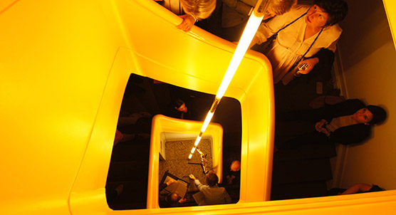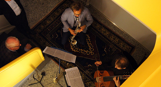 In zwei Konzertblöcken wechselten sich getragene Klänge mit jazzigen Arrangements zum Mitwippen ab; unter bekannte Stücke wie Mozarts Türkischen Marsch mischten sich immer wieder eigene Kompositionen. Und ganz nebenbei verrieten die Musiker viel Wissenswertes über ihre Instrumente und die Musik der jeweiligen Epoche – immer mit Blick nach oben, wo die Besucher entlang des Treppengeländers ihre Plätze eingenommen hatten.