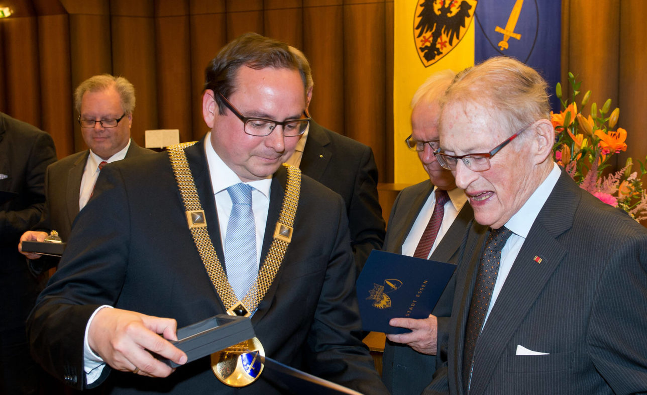 In diesem Jahr ehrte die Stadt Essen auch den Architekten und Gründer unseres Büros, Günter Koschany. Mit der Ehrenplakette ausgezeichnet wurde er für sein langjähriges Engagement als Initiator der Aktionsgemeinschaft „Essen. Großstadt für Kinder“. Seit über 40 Jahren setzt sich der Architekt leidenschaftlich und unermüdlich für Essens Kinder und die Gestaltung einer kinder- und familienfreundlichen Großstadt Essen ein. In den 1970er Jahren zunächst als Mitbegründer des Vereins „Mehr Platz für Kinder“, 1988 als Initiator der Aktionsgemeinschaft „Essen. Großstadt für Kinder“ und 2006 schließlich als Gründungsstifter der „Kinderstiftung Essen“. Für sein begeistertes und nachhaltiges Engagement wurde er 1997 mit dem Bundesverdienstkreuz am Bande geehrt.