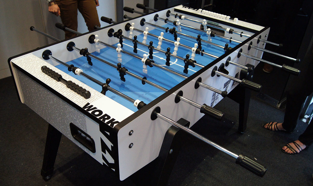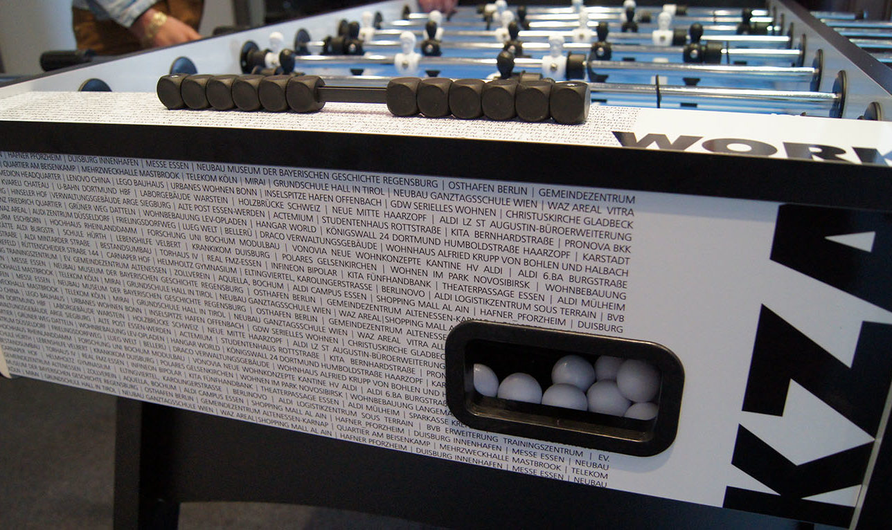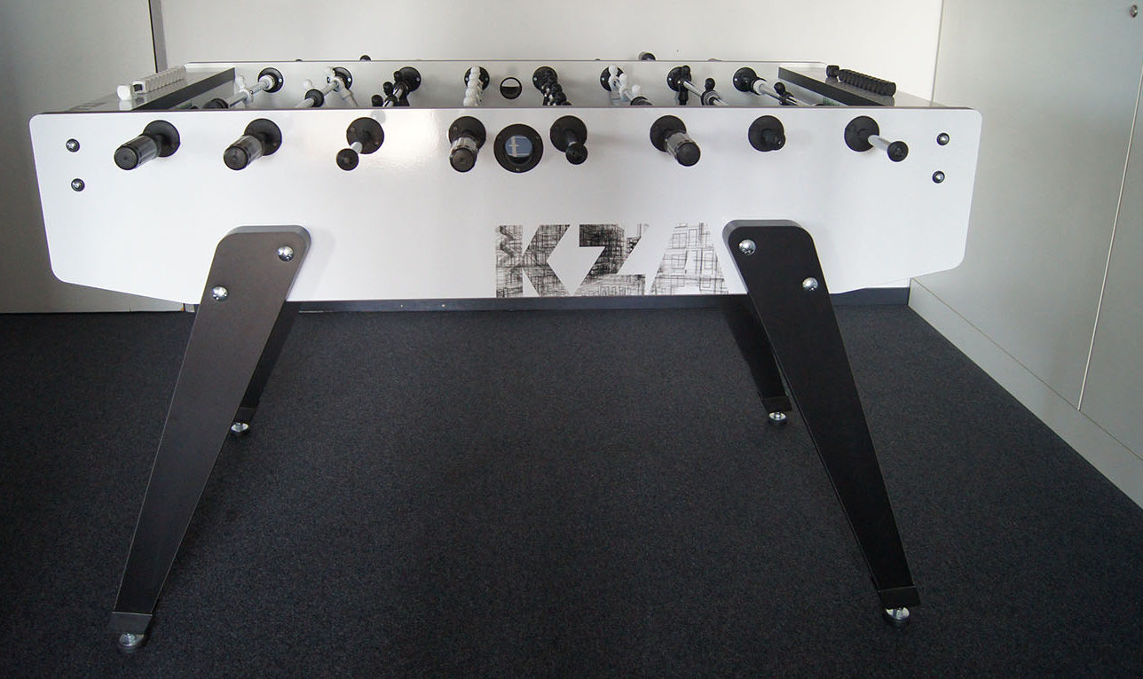 Für den Kickertisch im KZA-Design war das Turnier eine gelungene Bewährungsprobe. Seit wenigen Wochen steht das neue Spielgerät in einer der KZA-Büroetagen. Das Design in Blau, Schwarz und Weiß stammt – natürlich – aus dem Team und spiegelt grafisch die Arbeit des Büros wider: mit dem KZA-Logo, den Namen der Mitarbeiter und Projekte und abstrahierten Bauzeichnungen.