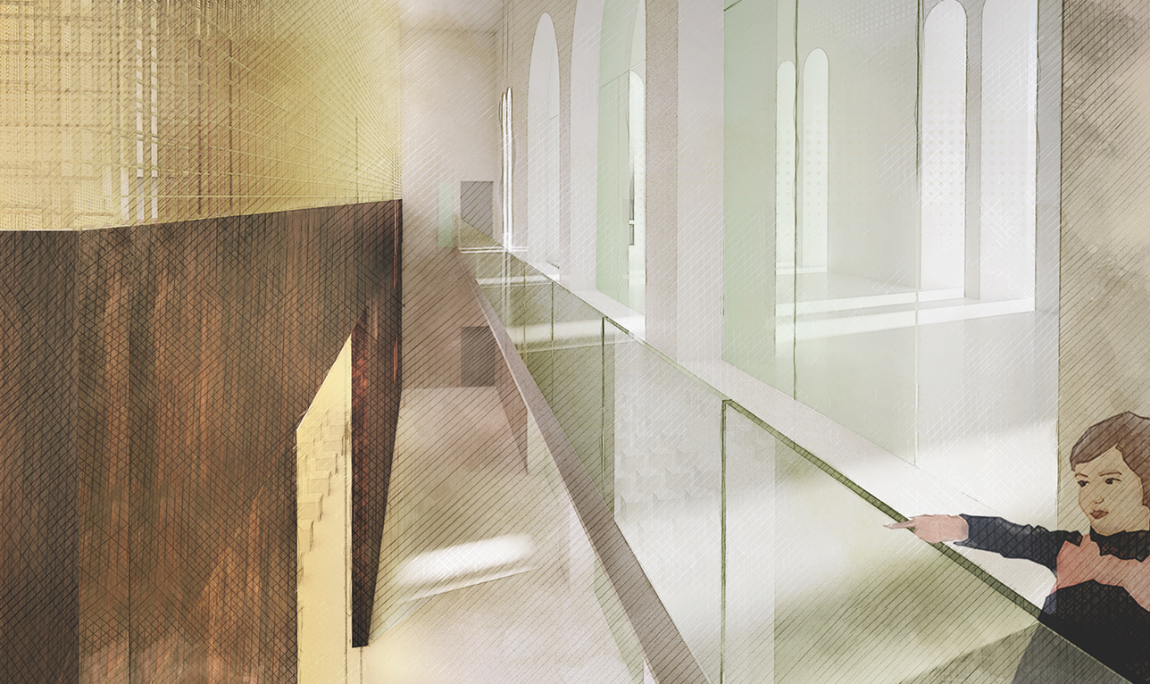 Der Entwurf sieht vor, die Fenster der Seitenschiffe bis auf den Boden des Erdgeschosses herunterzuziehen. Im linken Seitenschiff lässt sich das Gemeindecafé verorten: helle Räume, die einen freien Zugang zur Außenterrasse bieten und damit Offenheit symbolisieren. Der Jugendbereich ist in dem bestehenden rückwärtigen Anbau untergebracht. Auch hier bietet die Einteilung in verschiedene Bereiche größtmögliche Flexibilität für verschiedene Nutzungen.