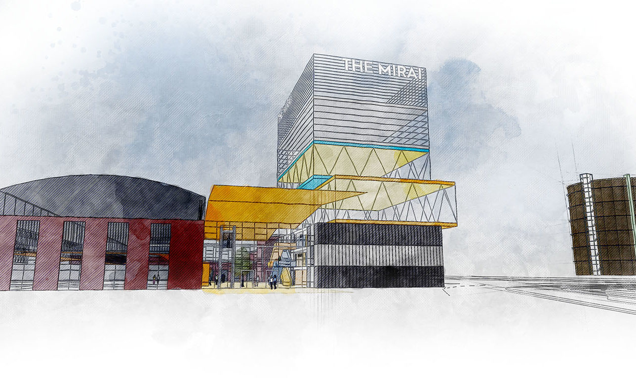 Von weit her sichtbar ist zukünftig vor allem das neue Empfangsgebäude, ein etwa 20 Meter hoher Turm mit wie gestapelt wirkenden, offen gestalteten Ebenen. Hier, so sieht es der aktuelle Entwurf vor, befinden sich die Umkleiden und Trainingsflächen. Sie bieten einen guten Blick auf die Umgebung und den Gasometer. Die oberste Ebene dient als Medienstudio für den weltweit ersten 24-Stunden-Fitnesskanal. Eine Werbefläche krönt das turmartige Gebäude und lässt den Schriftzug „THE MIRAI“ über Oberhausen leuchten.