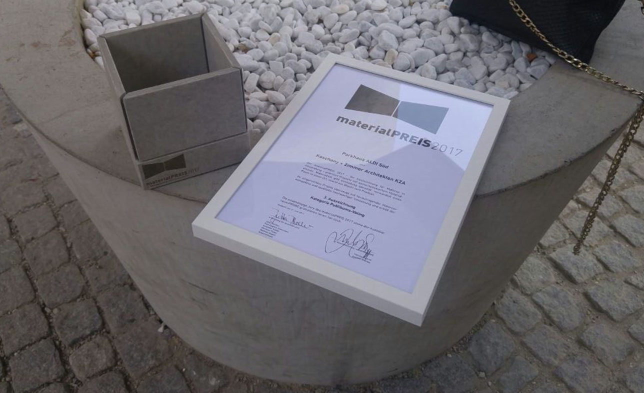 Über die Homepage der Stuttgarter Materialagentur Raumprobe hatten sich insgesamt 280 Architekten, Planer und Designer aus ganz Europa mit ihren Projekten dem Votum des Publikums gestellt. Gemeinsame Vorgabe für alle Einreichungen: der aufsehenerregende Einsatz besonderer Materialien. Auf das von KZA entwickelte Parkhaus von ALDI Süd in Mülheim an der Ruhr traf das zu. Denn die Verkleidung mit perforierten Alu-Paneelen vermittelt aus der Ferne den Eindruck eines Blicks in den Wald – und soll damit die Sicht auf eine mit Bäumen eingefasste Wiese ersetzen, die dem Neubau auf dem Firmengelände weichen musste.