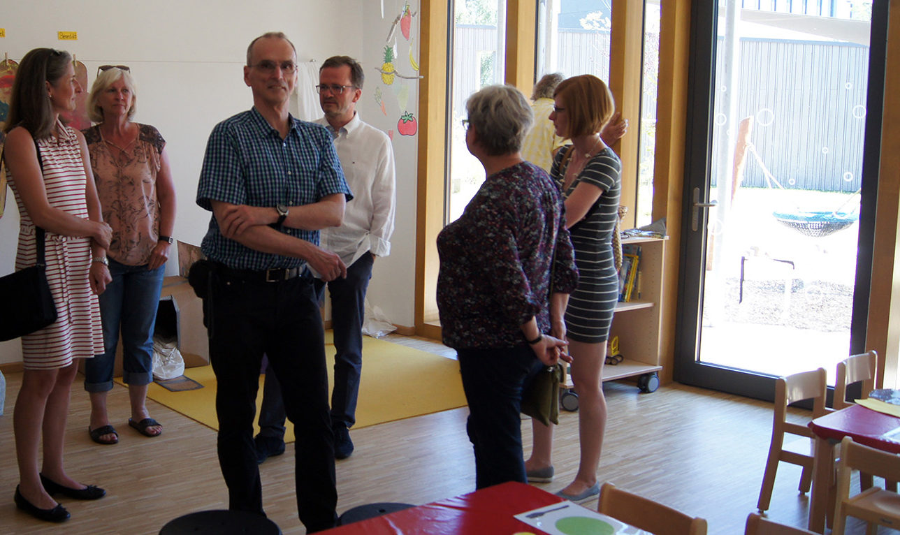In zwei Führungen stellten KZA-Geschäftsführer Axel Koschany und Kita-Leiterin Katharina Großmann das Konzept des Holz-Beton-Hybridbaus vor. Im Sommer 2017 übergab das KZA-Team das Gebäude, das seither von den Kinderzentren Kunterbunt betrieben wird. „Uns ging es von Anfang an um eine andere Architektursprache und Materialität als bei den Bürogebäuden“, betonte Koschany.