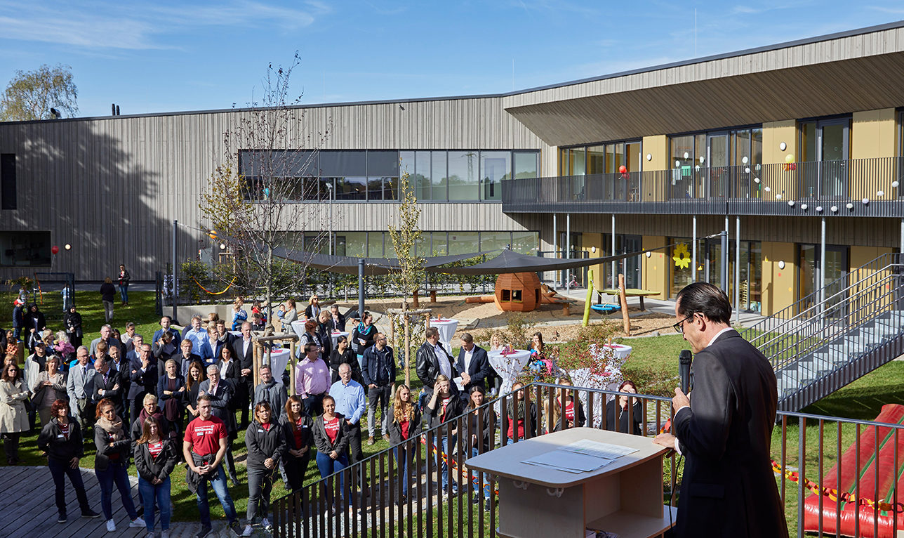 Large windows, cupboards to climb in and plenty of space: The first day nursery on the site of the ALDI South headquarters in Mülheim is a great place to play, learn and rollick around. At the opening ceremony, there was a lot of praise for the special building.