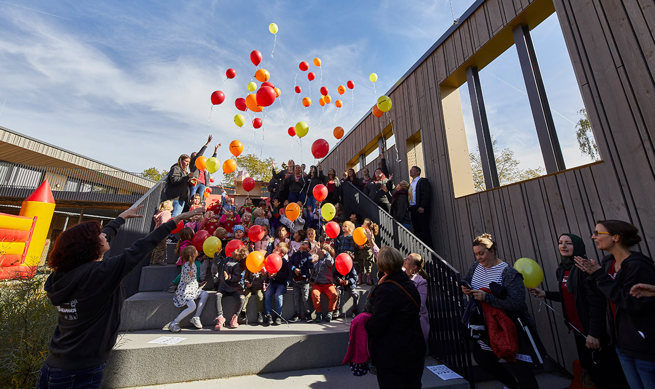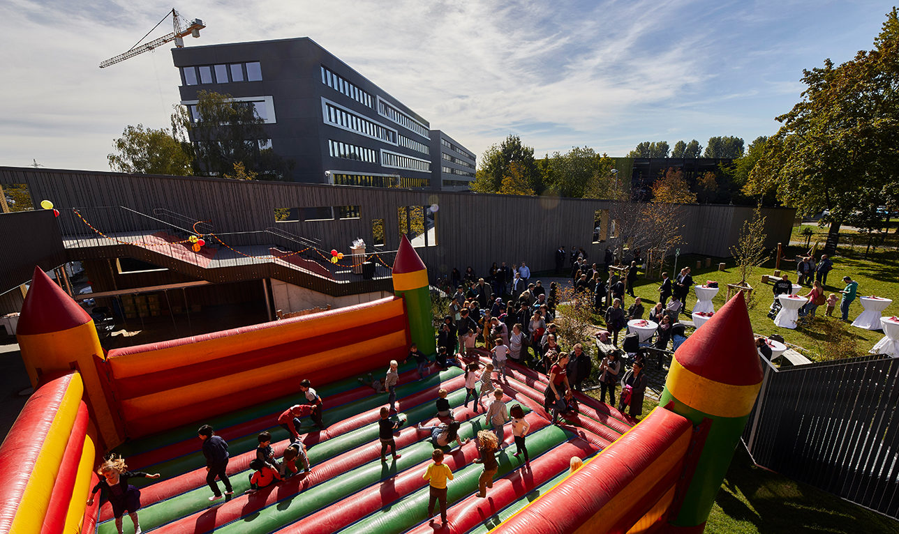 Since last summer, everyday life has been going on in the “Kiku Burgmäuse”, as the day nursery is named officially. Now the children celebrated the first summer party – together with the nursery team, their parents and many guests. The participating planners and the architects of the KZA office were also there.