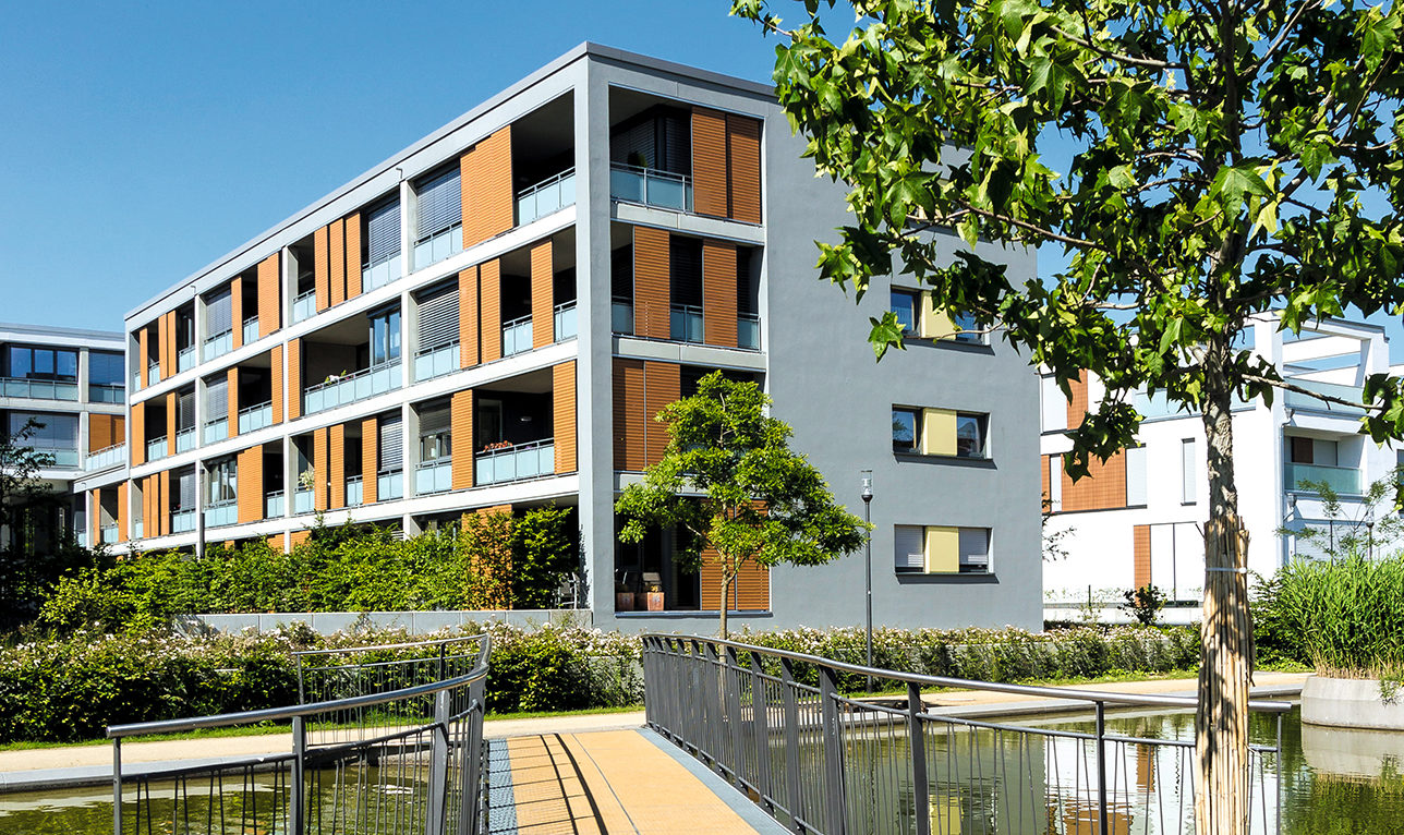 Dabei wurden hohe ökologische und stadtklimatische Ziele verwirklicht: Die Dachflächen sind begrünt, das Niederschlagswasser fließt in den angrenzenden See, und der Gemeinschaftsgarten mit Laubbäumen trägt zur Klimaregulierung bei. Eine besondere Herausforderung für die Planer: Von der knapp 5.000 m² großen Außenanlage ist etwa die Hälfte unterbaut.