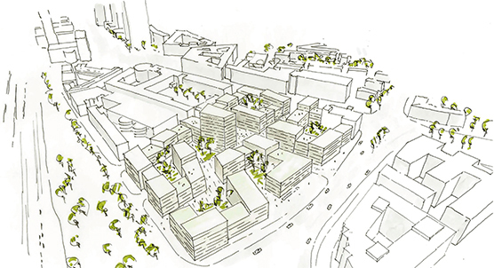Das Konzept von KZA folgt dem Anspruch, ein identitätsstiftendes urbanes Quartier zu schaffen. Drei Baukörper im nördlichen Bereich des Grundstücks sind so ineinander verschränkt, dass interessante Raumfolgen im öffentlichen und halböffentlichen Raum sowie verschiedenste Freiraumsituationen entstehen. Die Gebäude gliedern das Quartier und werden den unterschiedlichsten Bedürfnissen der Bewohner gerecht.