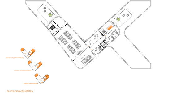 Den Abschluss bildet eine Veranstaltungsetage mit flexiblen Konferenzflächen. Ein Licht- und Medienkonzept erlaubt es, den Veranstaltungsraum in seiner Wahrnehmung auf unterschiedlichste Weise zu inszenieren.