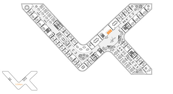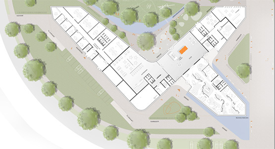 Das von KZA konzipierte Bürogebäude spannt sich zwischen den drei Ecken des Grundstücks und bildet dabei zwischen den Gebäudeflügeln drei dreieckige Höfe aus. Diese Höfe bilden die externe Adresse und Vorfahrt von der Erschließungsstraße aus wie auch die interne Adresse entlang der Fußgängerpassage im Innovationspark. Der dritte Hof nimmt die flankierende Grünfläche auf und bindet sie als großzügigen Erholungsraum in das Grundstück ein.