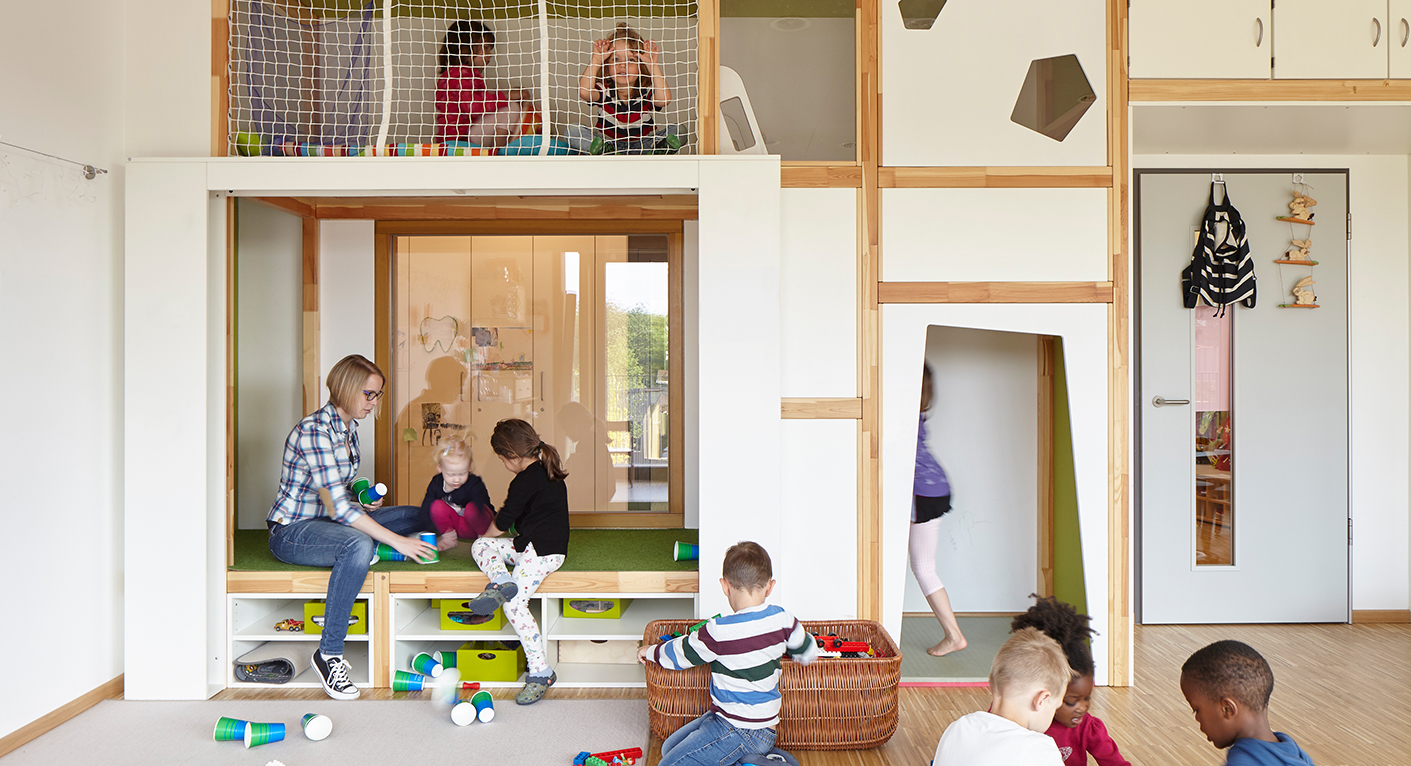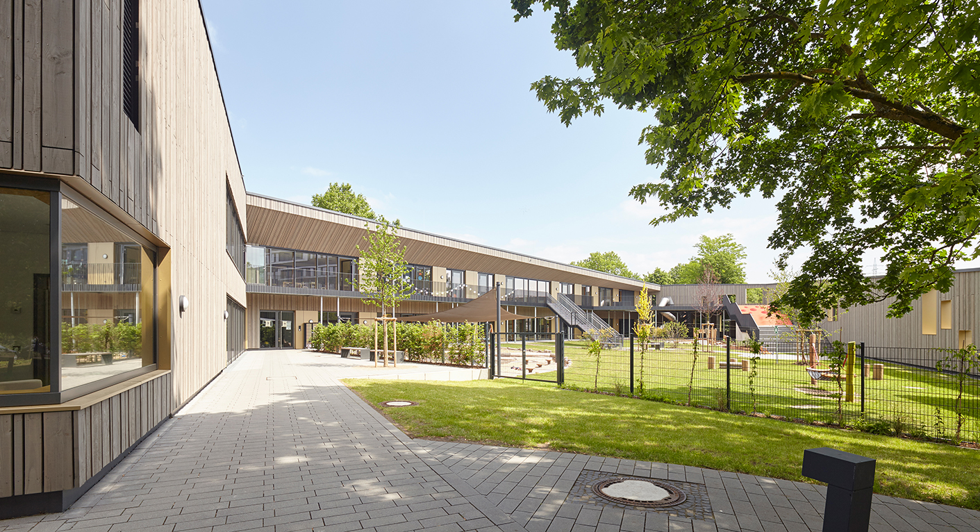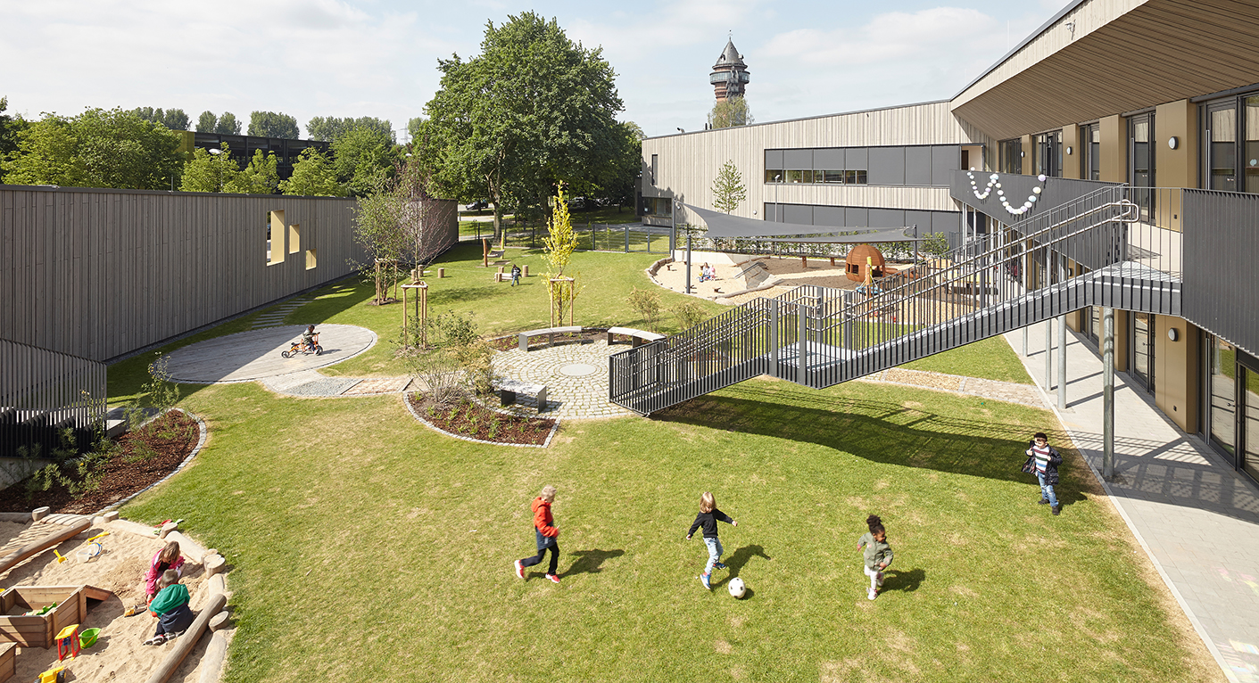 Die Kindertagesstätte mit integriertem Familienzentrum ist als Ergänzung zur Erweiterung der Hauptverwaltung der Unternehmensgruppe Aldi Süd am Mülheimer Standort Burgstraße entstanden. Das KZA-Team hat das Gebäude als Holzsystembau geplant und errichtet. Seit Sommer 2017 können hier rund 110 Kinder betreut werden, davon die Hälfte Angehörige von Aldi-Mitarbeitern. Weitere 50 Prozent der Betreuungsplätze wurden an Kinder aus dem Stadtteil Styrum vergeben. Betreiber der Einrichtung sind die Kinderzentren Kunterbunt.