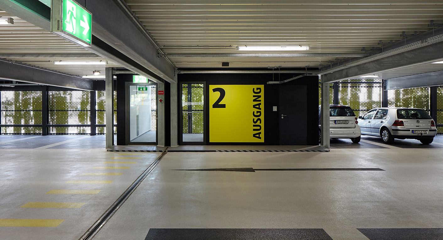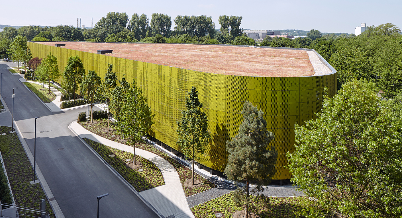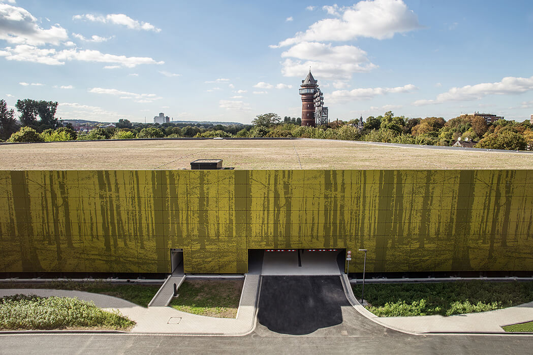 Parallel zur Erweiterung des Bürostandortes der ALDI-Süd-Hauptverwaltung entwickelte das Team von KZA am äußeren Grundstücksrand ein Parkhaus für die Mitarbeiter des Handelsriesen. Ein Standort im Grünen in direkter Nachbarschaft zur Ruhr. Diesen besonderen Ort würdigend, entwickelten die Planer ein außergewöhnliches architektonisches Konzept: „Wenn die Mitarbeiter wegen des neuen Parkhauses das dichte Grün der vielen Bäume zukünftig nicht mehr sehen können“, beschreibt Axel Koschany die Planung, „dann holen wir die Bäume eben auf die Fassade des Gebäudes. Mit diesem Satz sind wir in die Konzeption des Baus gestartet.“