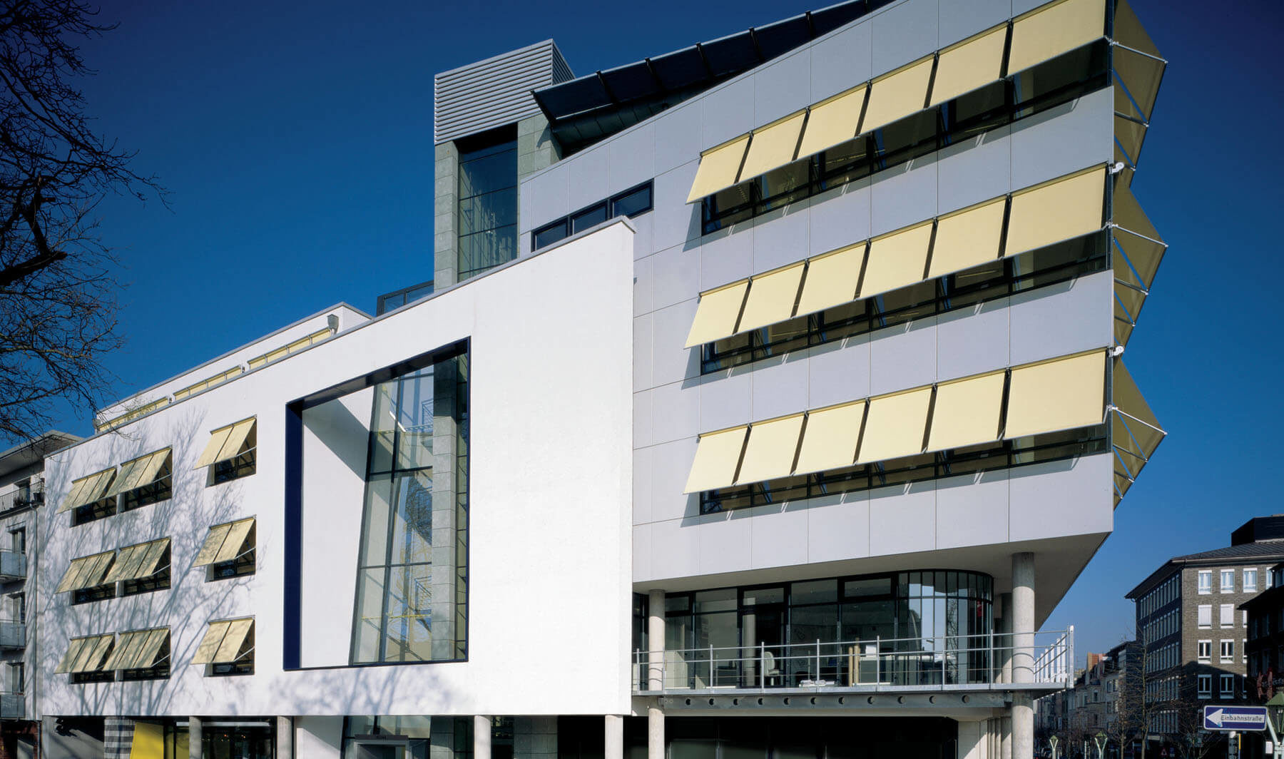 Zwei Baukörper, deren Fassaden auf die jeweilige Straßensituation abgestimmt sind, schieben sich an der Ecke ineinander. Hier öffnet sich die Fassade zu einer mehrgeschossigen Eingangshalle.