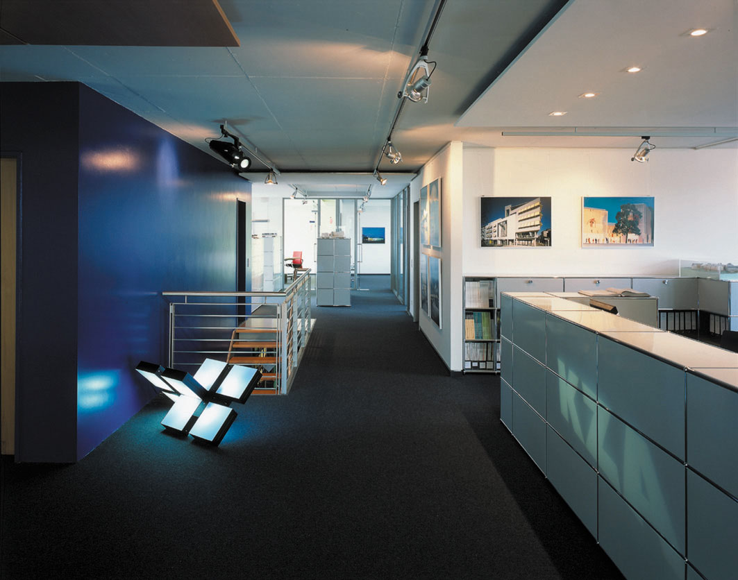 Das Erdgeschoss bietet Raum für Ladenlokale, die Obergeschosse werden von Büroräumen belegt. Mit einem Doppelparksystem in der Tiefgarage wird die Parkplatzfrage auf dem hoch ausgenutzten innerstädtischen Grundstück gelöst.