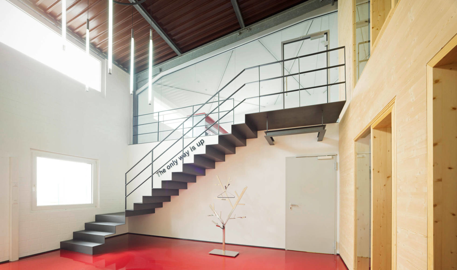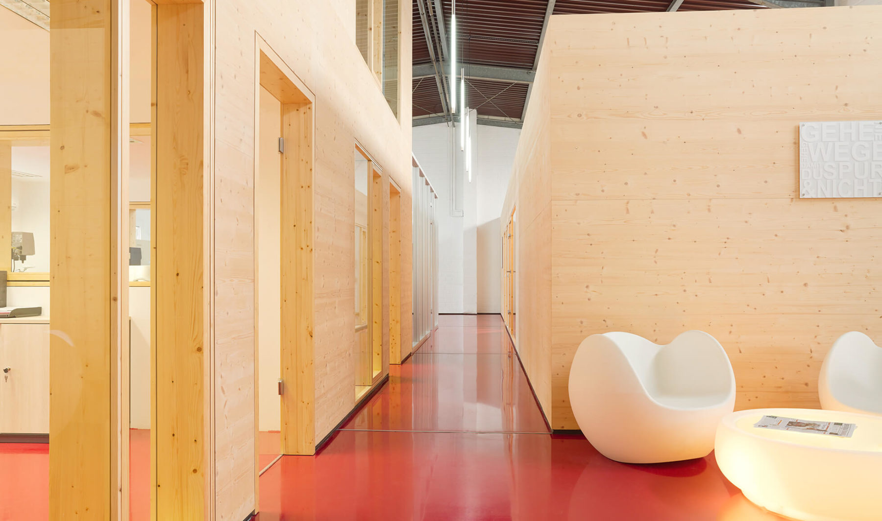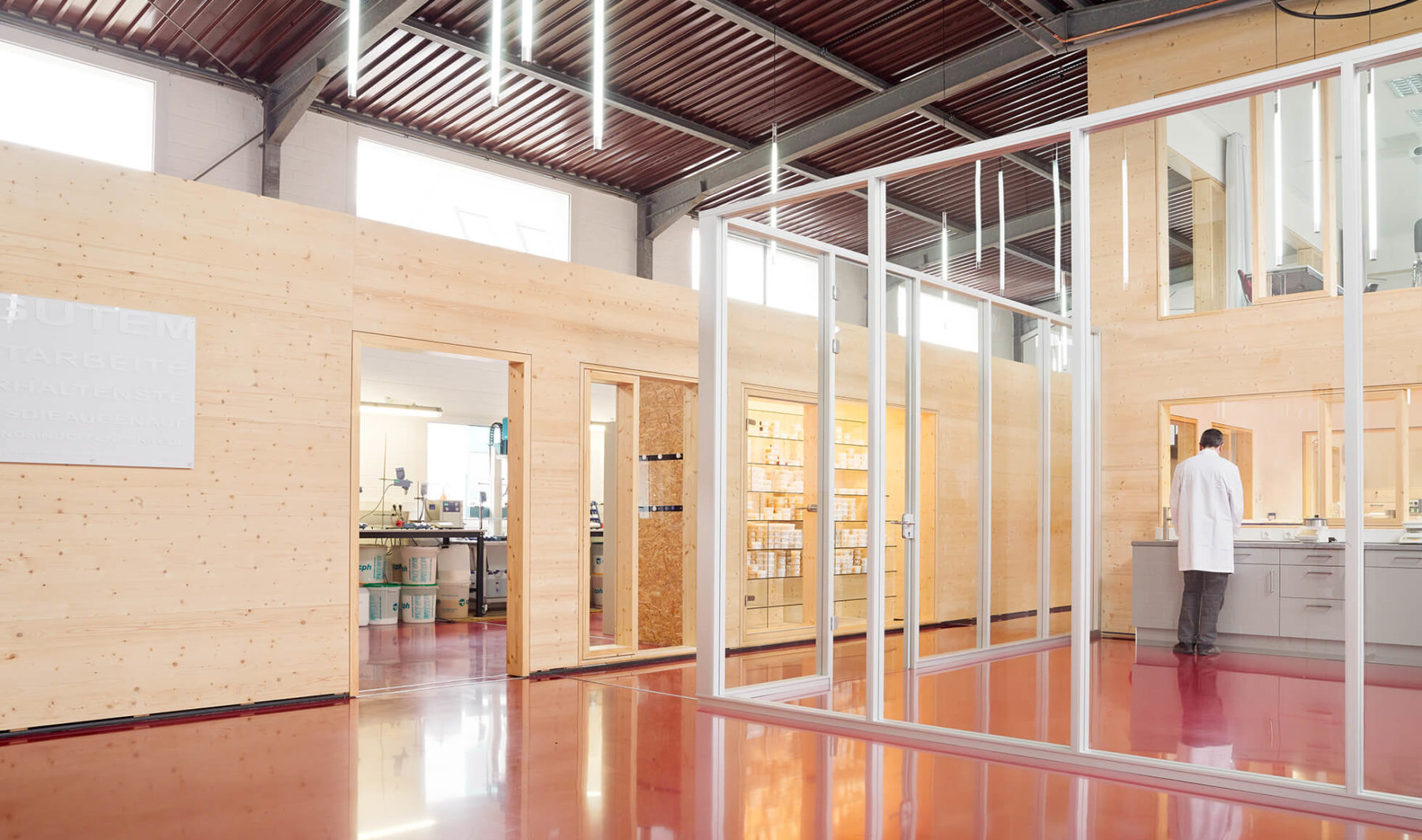 Da bei der Umbaumaßnahme technisch keinerlei konstruktive Einbindungen des Daches möglich waren, entschied sich das KZA-Team kurzerhand dazu, Gebäudeteile für „kleinteiligere“ Nutzungen in die Halle einzustellen. Diese Bauteile sollten sich klar vom Gesamtbaukörper ablösen und optisch unterscheiden. „Die Verwendung von naturbelassenem Holz mit seiner ganz eigenen Materialität bietet einen guten Kontrast zum Bestandsbaukörper, hat einen hohen Grad an Vorfertigung und ist zugleich Ausdruck des Unternehmens für seine umweltschonenden Produkte“, betont der projektleitende KZA-Architekt Dietmar Neß. „Dank großer vorhandener Werkshallentore war es möglich, mit vorgefertigten Elementen zu arbeiten“. Weitere Hingucker sind der rote Epoxidharzboden und die frei schwebende Stahltreppe.