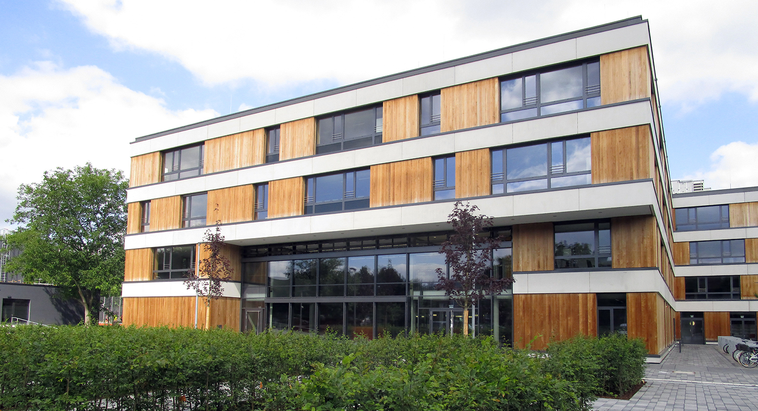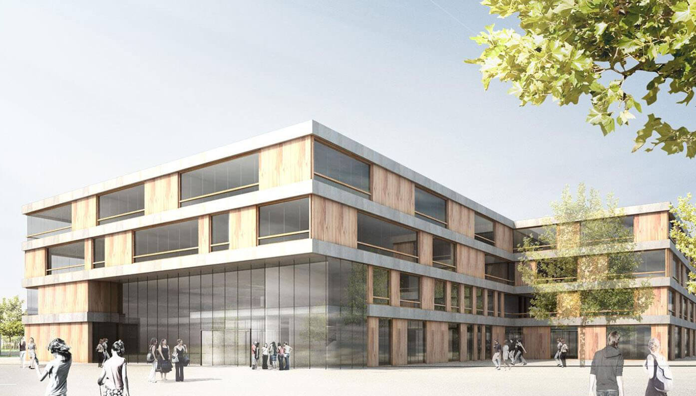 Der vom Stuttgarter Büro h4a entworfene Neubau besteht aus drei in sich verschränkten Baukörpern, die jeweils über eigene Innenhöfe belichtet werden. Der viergeschossige Hauptbaukörper, der sich zum Eingangsplatz und zur Sudetenstraße orientiert, nimmt Foyer, Aula, Mensa und Verwaltung sowie die naturwissenschaftlichen Fachräume in den Obergeschossen auf. Daran schließt sich das viergeschossige Gebäude für die Sekundarstufe I mit 40 Klassenräumen an. Weitere zehn Klassenräume erhält die Sekundarstufe II in einem zweigeschossigen Baukörper. Durch die versetzte Anordnung der Bauteile entstehen Außenräume mit hoher Aufenthalts- und Nutzungsqualität und mit spannenden Durch- und Einblicken in die Landschaft.