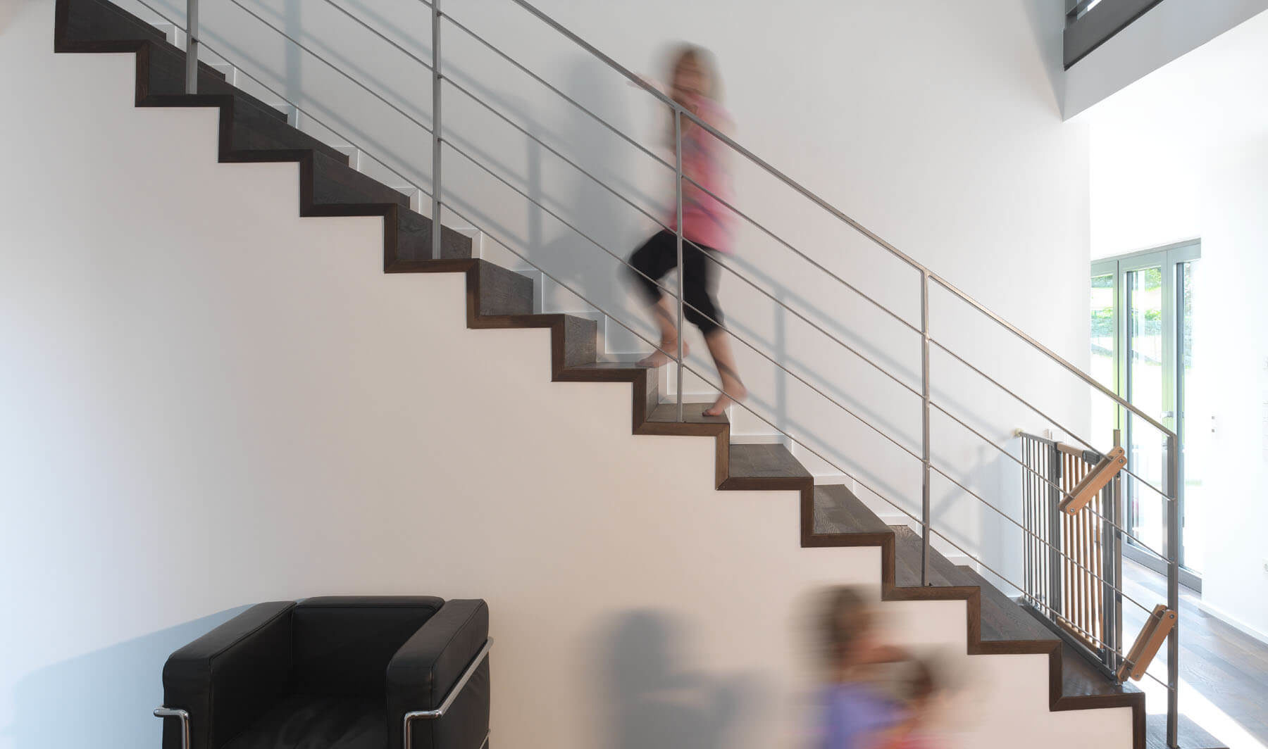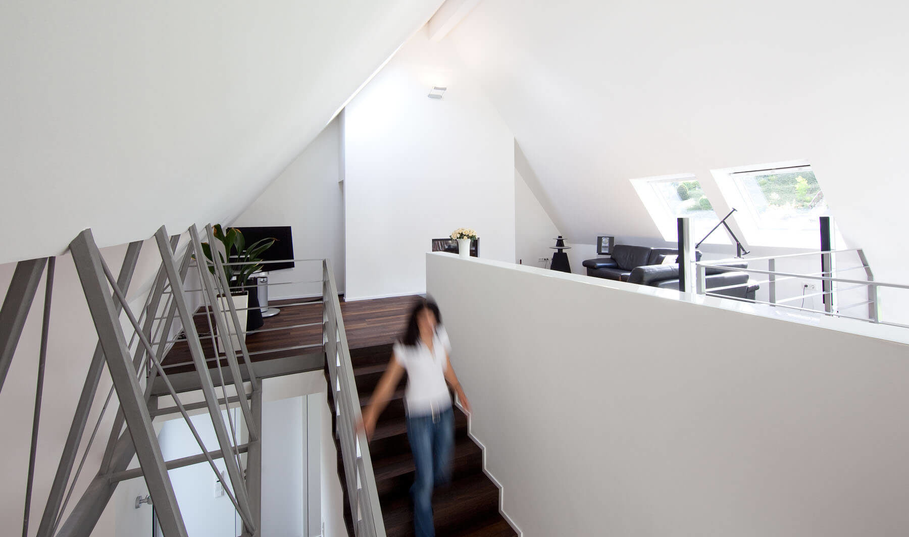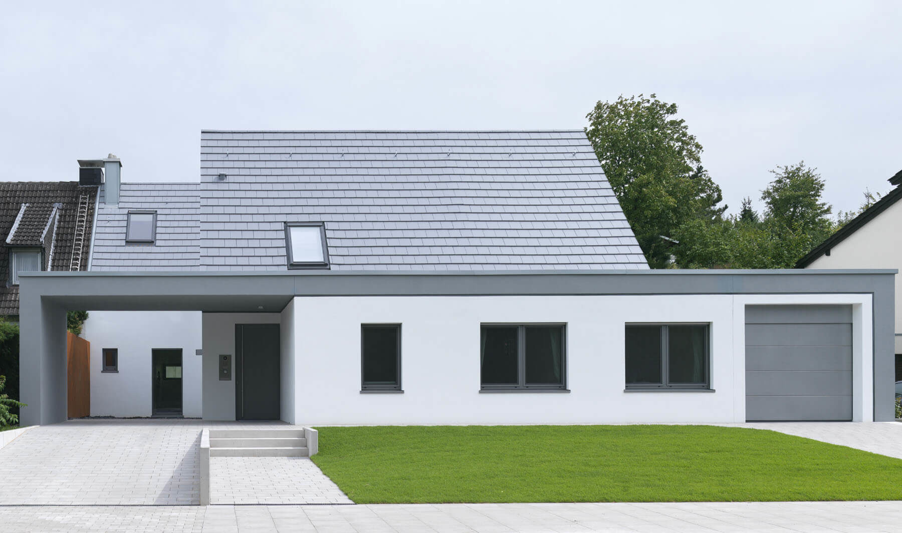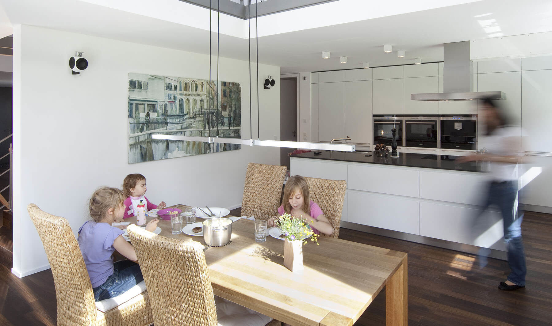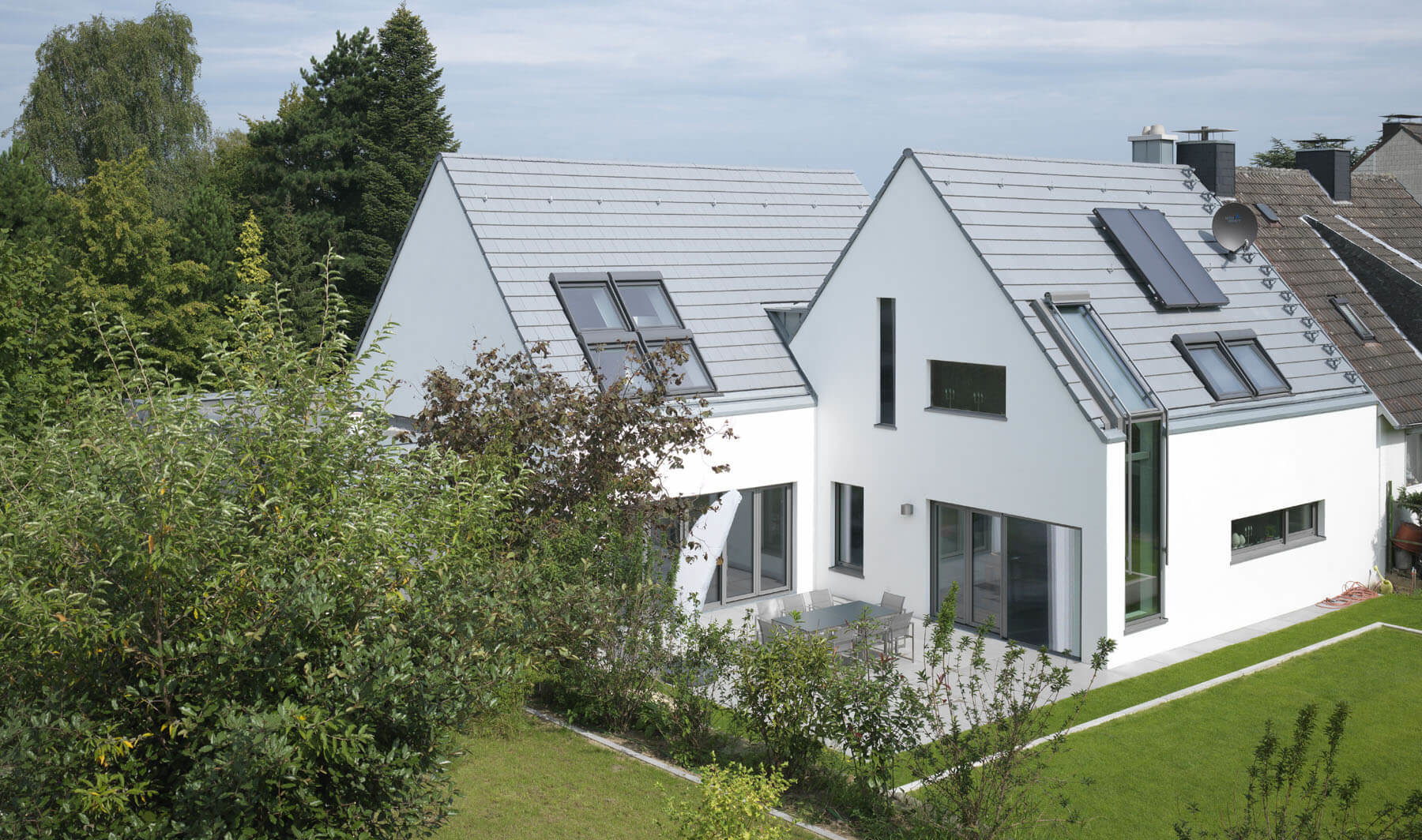 Innen ergeben sich aus der Durchdringung der Häuser spannende Durch- und Ausblicke und neue Perspektiven. Außen orientieren sich die Räume optimal zum Garten mit einer großzügigen und geschützten Terrasse.