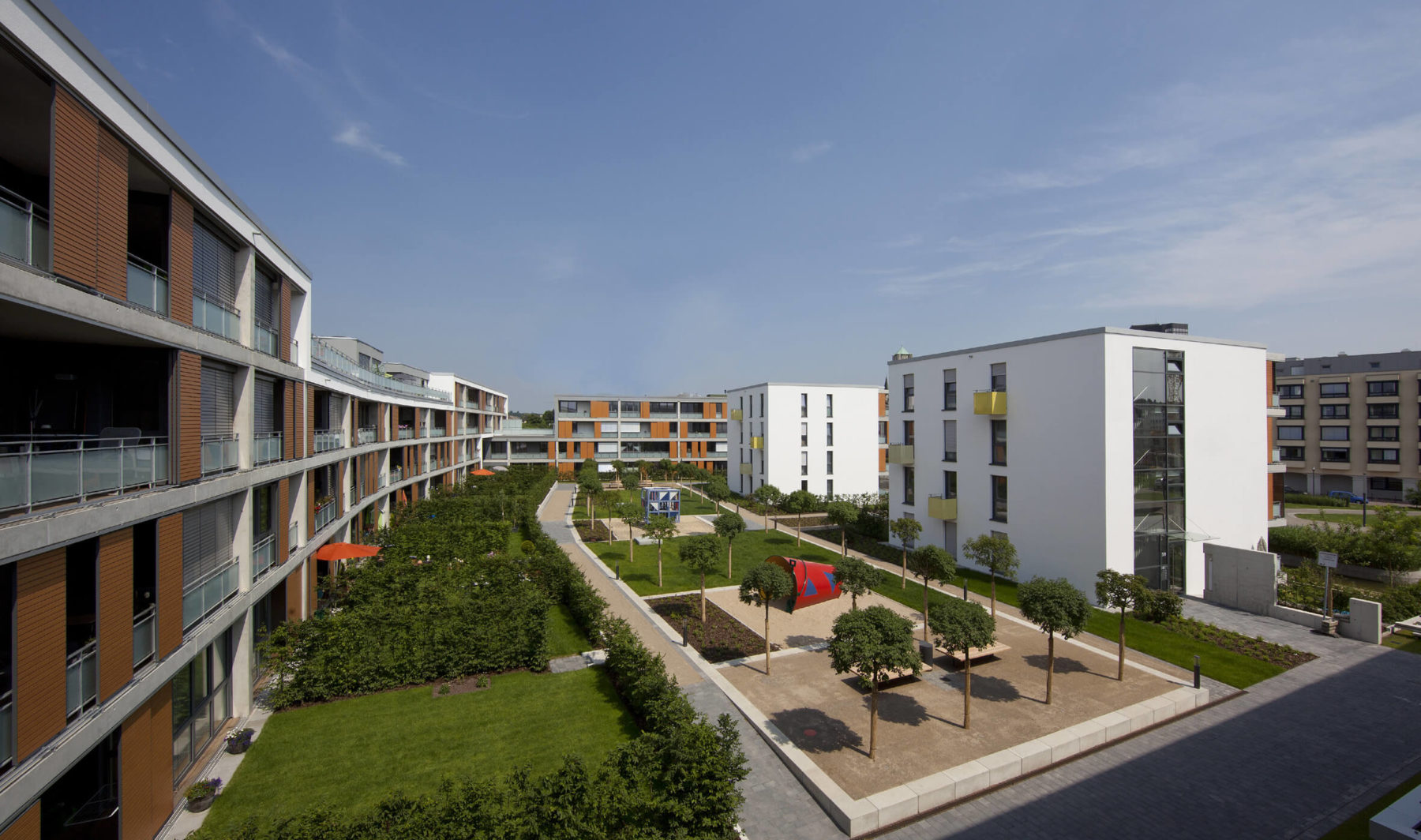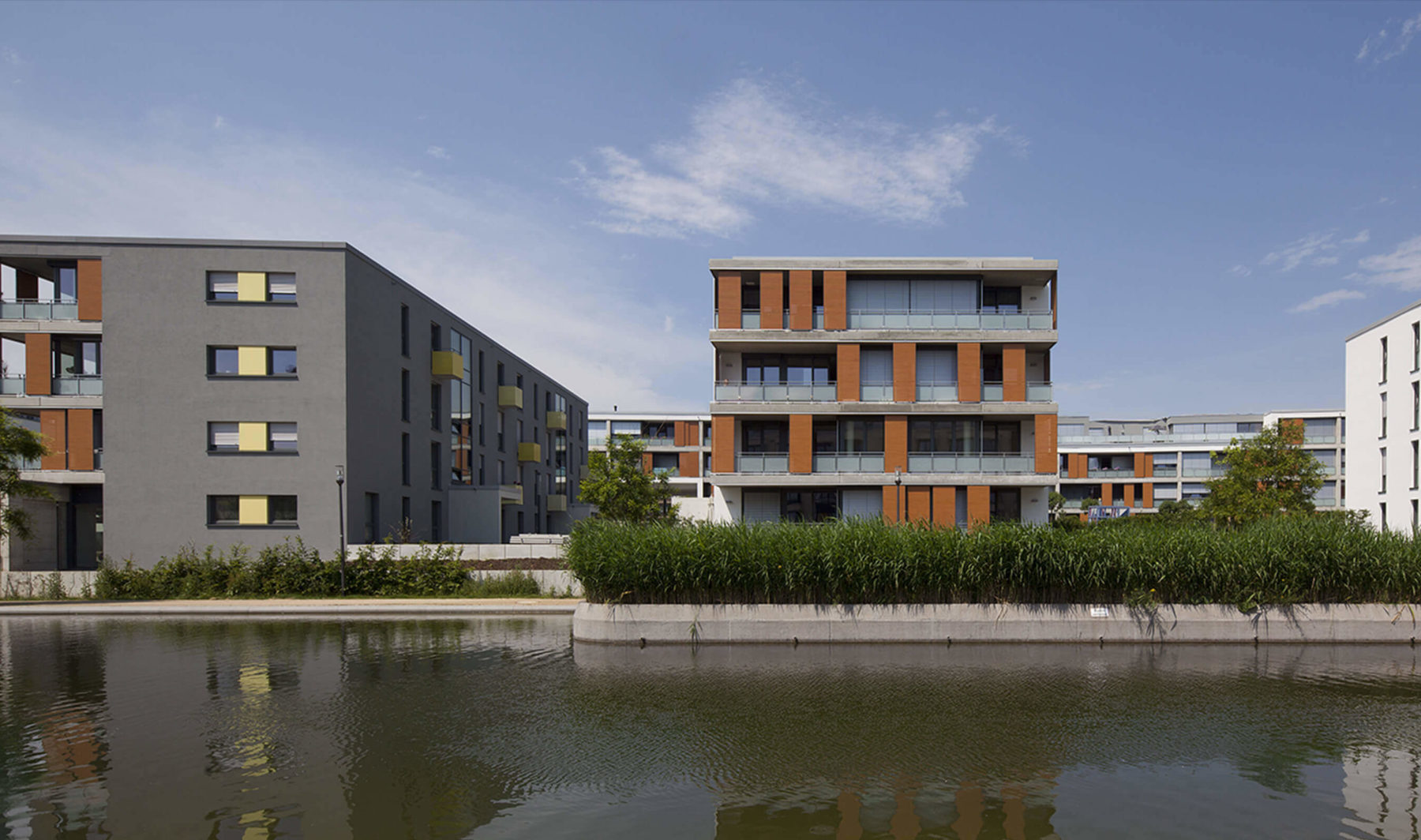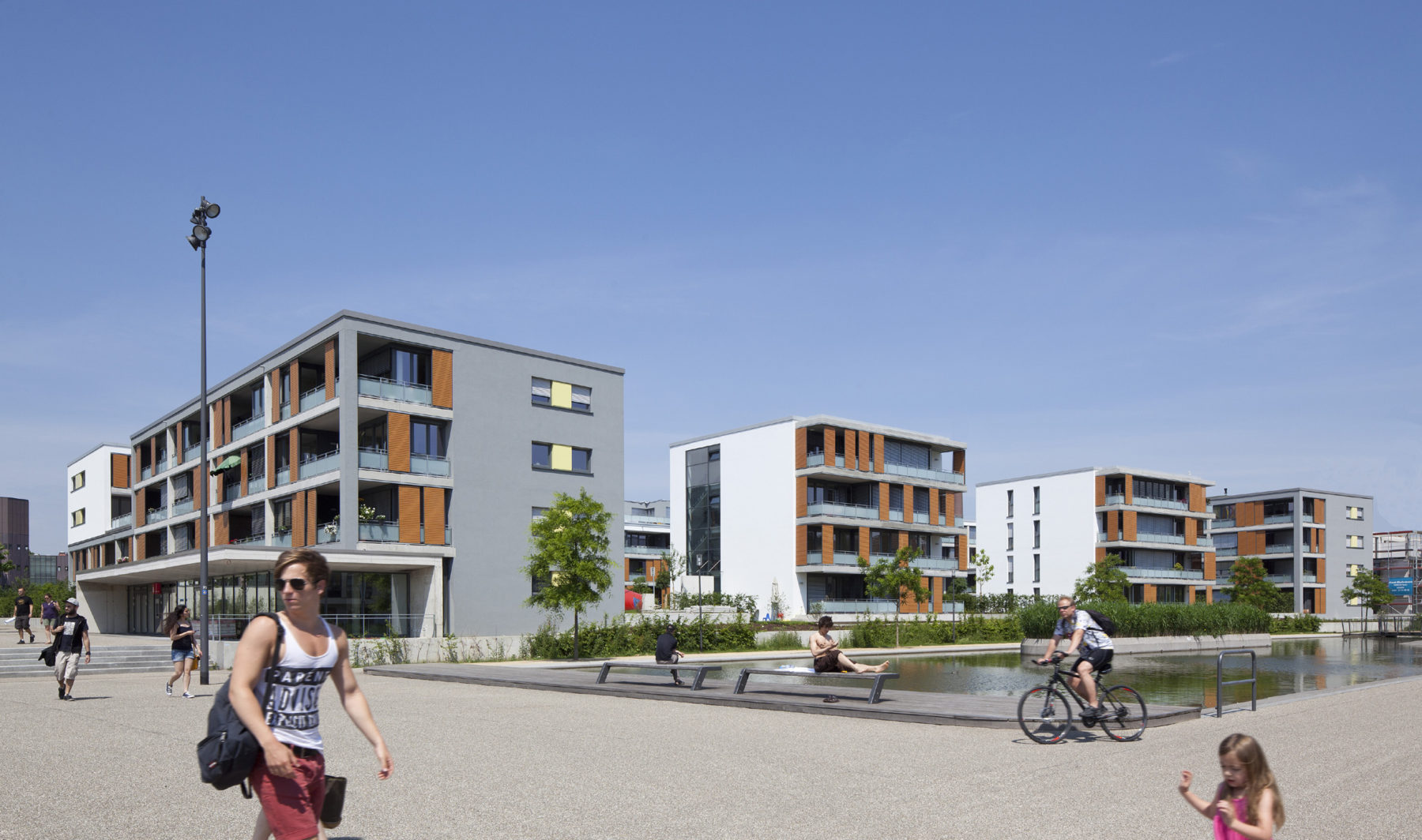 Die Wohnbebauung des PIER 78 zeichnet sich durch eine besondere Orientierung zur öffentlichen Park- und Platzsituation mit Gewerbefläche, Café und Außengastronomie aus. Sie markiert in besonderer Weise ihre prominente Lage an der Hauptverbindung und zentralen Achse zwischen Innenstadt und Universität und stärkt zugleich den zentralen Platz als Mittelpunkt des gesamten Areals.