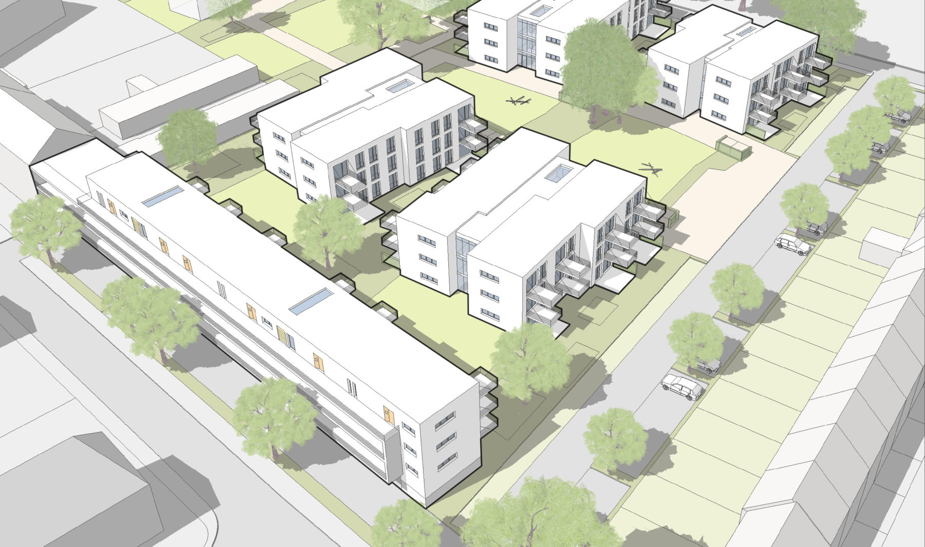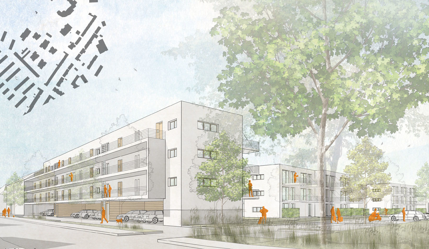 „Häuser im Grünen, zwischen den alten Bäumen, orientiert um eine gemeinsame Mitte als Erschließung und Ort der Begegnung“, beschreibt Axel Koschany die Grundidee für die Wohnhäuser. Dort sollen Familien, Singles und ältere Menschen gleichermaßen ein Zuhause finden. 25 Prozent des Wohnraums werden öffentlich gefördert. Das Wohnprojekt soll auf der Fläche einer bestehenden Schlichtbausiedlung entstehen.